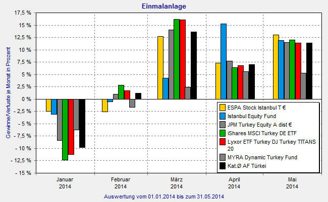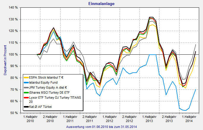 Der türkische Aktienmarkt ist nichts für Anleger, die Schwankungen scheuen. In den vergangenen Jahren konnte Aktienfonds vom Bosporus im Durchschnitt nicht ein einziges Mal ein positives Jahresergebnis wiederholen. In Zahlen sieht das so aus: 2010 steht für die Peergroup „Aktienfonds Türkei“ des FINANZEN FundAnalyzer (FVBS) ein Plus von 31,9 Prozent. Im Jahr darauf fiel sie mit 33,9 Prozent so stark wie keine andere Aktienfonds-Kategorie. 2012 hingegen performten türkische Aktienfonds alle anderen globalen Mitbewerber aus und konnten ihren Wert um 59,6 Prozent steigern. 2013 kam ein erneuter Fall – um 30,7 Prozent. Eine gewisse Regelmäßigkeit ist durchaus erkennbar und sie zeigt: 2014 müsste es mal wieder bergauf gehen. Und tatsächlich steht die Peergroup mit einem Plus von 23,8 Prozent per 31. Mai wieder vor allen anderen.