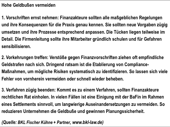 Finanzakteure sollten die härtere Gangart der BaFin keinesfalls auf die leichte Schulter nehmen. Die verschärfte Bußgeldpraxis sollte insbesondere allen künftig neu regulierten Akteuren als Weckruf dienen, allzu saloppe Arbeitsabläufe auf den Prüfstand zu stellen. Wer die Vorschriften konsequent befolgt, vermeidet böse Überraschungen und steigert obendrein noch die Servicequalität (siehe Infokasten „Hohe Geldbußen vermeiden“).
