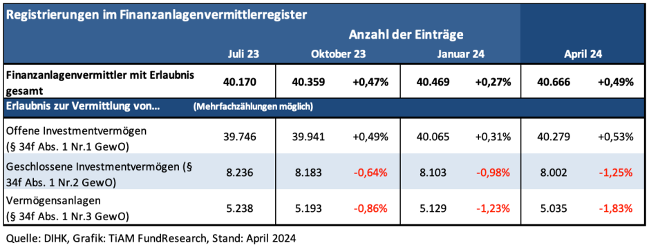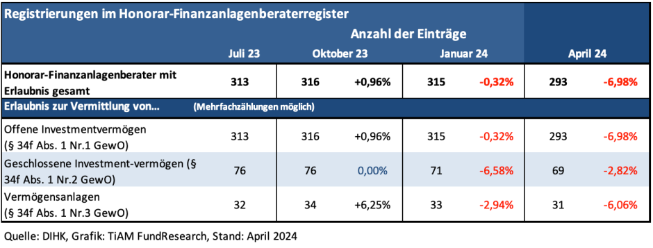 Nun ist das Gegenteil passiert. Das zeigt die aktuelle DIHK-Statistik registrierter Finanzanlagenberater und Vermittler (siehe Tabelle oben). Laut DIHK sind in Deutschland derzeit nur noch 293 Honorar-Finanzanlagenberater registriert. Das ist ein Rückgang um sechs Prozent innerhalb eines Quartals. Im Gegenzug stieg die Zahl der registrierten Finanzanlagenvermittler nach Paragraf 34f GewO von zuletzt 40.469 auf aktuell 40.666. Mit anderen Worten: Für jeden Honorarberater, der aufgab, meldeten sich in den vergangenen drei Monaten mehr als zehn neue Vermittler an, die auf Provisionsbasis arbeiten (siehe Tabelle unten).