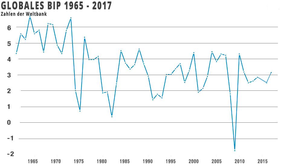 Heute früh warnte die Chefin des Internationalen Währungsfonds Christine Lagarde, das Wachstum der Weltwirtschaft werde in diesem Jahr “nur” rund 3,5 Prozent erreichen – nach 3,7 Prozent im vergangenen Jahr. Die Weltbank kommt hingegen auf andere Werte; nach deren Berechnung fällt das globale BIP von 3,0 auf 2,9 Prozent, doch die Tendenz zeigt in die gleiche Richtung. Aber ist das schon Anlass zur Besorgnis? Zur Erinnerung: Dass die Wachstumsraten der Weltwirtschaft zurückgehen, war in der Vergangenheit nicht ungewöhnlich – wenn man bei einem Rückgang um 5,4 bzw. 3,3 % – je nach Quelle – überhaupt von einem Einbrechen reden mag. Tatsächlich zeigt ein Blick auf die Vergangenheit, dass sich die Wachstumsraten des globalen BIP seit 2011 in einem Band zwischen 2,5 und 3,1 % eingependelt haben – historisch betrachtet eine ungewöhnlich lange stabile Reihe.