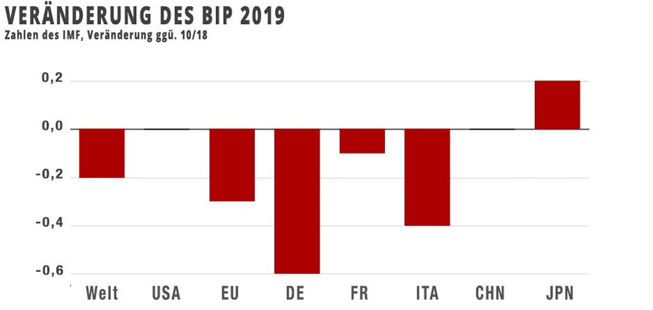 Schuld an den revidierten Erwartungen des IWF ist übrigens vor allem die hinkende Wirtschaft in Deutschland. Hierzulande soll das Wachstum der Wirtschaft um 0,6 % sinken, erwarten die Ökonomen vom Währungsfonds. Das – zusammen mit negativen Zahlen aus Frankreich und Italien – reduziert das Wachstum der Eurozone dann um 0,3 % und eben das der ganzen Welt um 0,2 %.