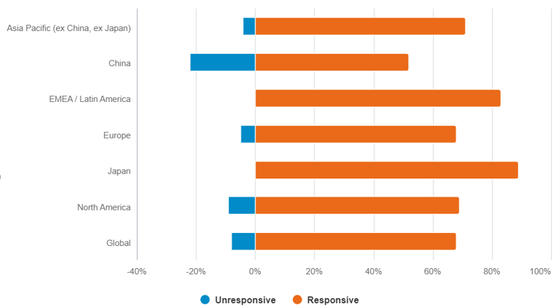 Weltweit gaben die Fidelity-Analysten an, dass 68 Prozent der von ihnen untersuchten Unternehmen in den letzten zwölf Monaten auf ihre Engagement-Bemühungen reagiert haben. An der Spitze stehen Unternehmen in Japan mit 89 Prozent gefolgt von EMEA/Lateinamerika (83 Prozent) und Asien-Pazifik ex China und Japan (71 Prozent).