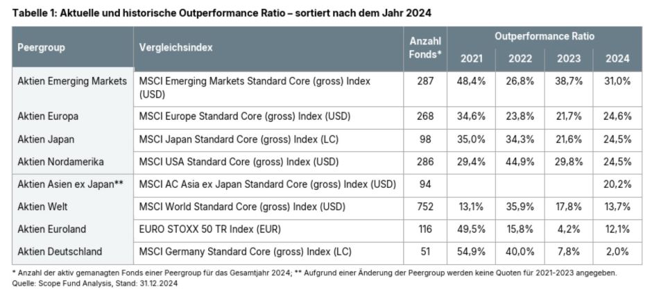 * Anzahl der aktiv gemanagten Fonds einer Peergroup für das Gesamtjahr 2024; ** Aufgrund einer Änderung der Peergroup werden keine Quoten für 2021-2023 angegeben. Quelle: Scope Fund Analysis, Stand: 31.12.2024