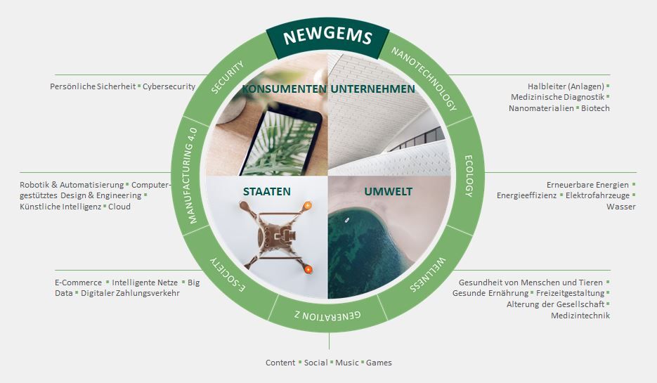 im Rahmen der regelmäßigen Analysen langfristiger Trends haben Experten von Degroof Petercam AM untersucht, wie sich Konsumenten, Unternehmen, Regierungen und die Umwelt entwickeln werden, welche Transformationsprozesse also auf dem Weg zur Gesellschaft 5.0 ablaufen werden. Dabei haben sie folgende Investmentthemen identifiziert, die nach ihrer Einschätzung bereits wichtig sind und noch bedeutender werden: Nanotechnology, Ecology (Umwelt), Wellness, Generation Z, E-Society, Manufacturing 4.0 (Industrie 4.0), Security (Sicherheit). Zusammengefasst unter dem Akronym NEWGEMS nach den Anfangsbuchstaben der englischen Begriffe. Mit 70 bis 80 Portfoliowerten ist das Fondsportfolio global breit diversifiziert.