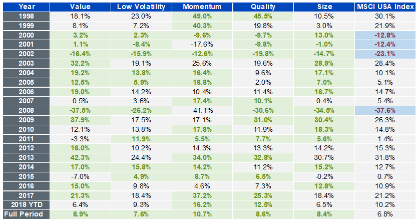 Unterschiedliche Faktoren entwickeln sich zu unterschiedlichen Zeiten gut. Wie die Abbildung unten verdeutlicht, konnte keiner der Faktoren in jedem einzelnen Kalenderjahr eine Outperformance verbuchen. Da es aus praktischer Sicht unmöglich ist, durchweg im Vorfeld zu wissen, welcher Faktor sich am besten (oder schlechtesten) entwickeln wird, ist ein Multifaktor-Ansatz unseres Erachtens sinnvoll.