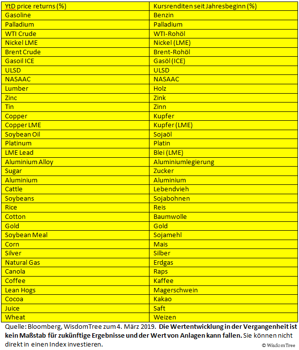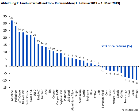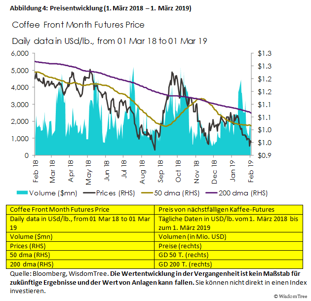 Trotz der starken Performance der Rohstoffmärkte haben sich die Kurse der Arabica-Kaffee-Futures (Bloomberg-Ticker: KC1 Comdty) seit Beginn des Jahres miserabel entwickelt und ein Minus von 4,81 % verbucht (zum 4. März 2019). Nach einer ähnlichen Preisentwicklung im Jahr 2017 konnten Kaffeepreise nicht von der anhaltenden höheren Risikobereitschaft profitieren. Das reichhaltige Angebot und die Schwäche des brasilianischen Real stellten eine Belastung für sie dar.