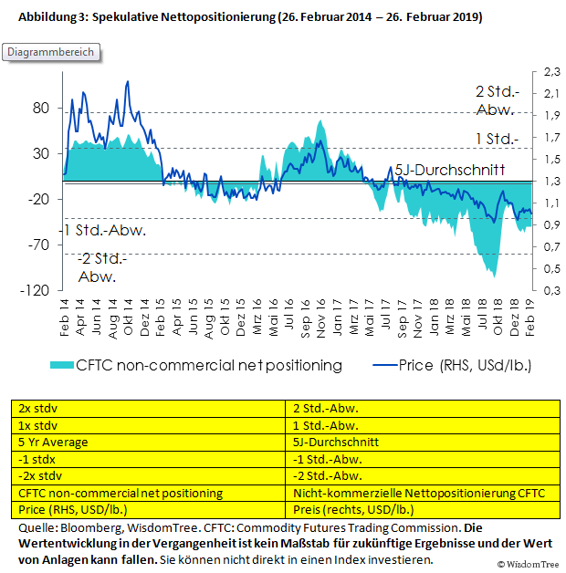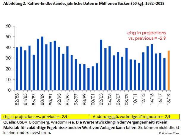 Beim Ausblick für die Kaffeepreise überwiegen für uns nach wie vor die Abwärtsrisiken, solange wetterbedingte Lieferschwierigkeiten ausbleiben. Kaffee wird allerdings zu einem deutlichen Abschlag gehandelt und etwaige wetterbedingte Lieferausfälle könnten eine Erholung der Kaffeepreise unterstützen, wenn so wie Ende September 2018 eine schnelle Eindeckung von Short-Positionen erfolgt.