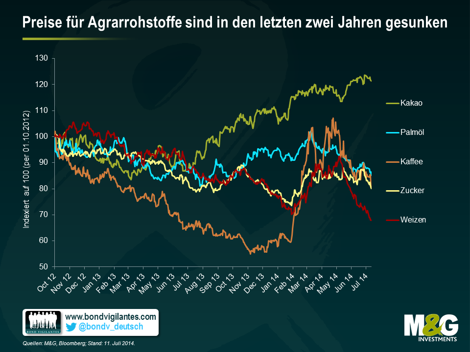 Glücklicherweise scheint sich die Entwicklung der Preise von Agrarrohstoffen (Kaffee, Zucker, Weizen etc.) in den letzten Monaten aber von der Preistendenz nicht-landwirtschaftlicher Rohstoffe (wie etwa Gold, Silber oder Platin) abgekoppelt zu haben. So deuten die Zahlen der letzten sieben Quartale darauf hin, dass die Preise vieler Agrarrohstoffe inzwischen sogar gesunken sind. Dies geht auch aus der nachfolgenden Grafik hervor.