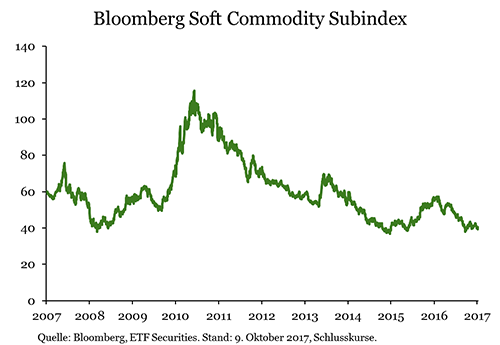 Agrarrohstoffe fielen fast wieder auf ihr Zehnjahrestief von 2015 zurück. Sieht man von Arabica-Kaffee ab, dürfte sich an der Flaute der Agrarrohstoffe nichts ändern. Die Herstellung von Rohrzucker läuft auf vollen Touren. Gleichzeitig nimmt die Konkurrenz seitens EU-Rübenzucker zu.