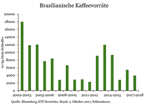 Trotz der ansonsten guten Ergebnisse könnten der Ertragsrückgang in Brasilien und die Eintrübung seines diesjährigen Ausblicks entscheidenden Einfluss auf die Preisentwickklung nehmen. Früher konnte Brasilien nach schlechten Ernten stets noch reichlich Bestände aus den Vorjahren verkaufen, allerdings sind die Vorräte des Landes deutlich geschrumpft. Das knappe Angebot dürfte sich wohl in diesem Jahr bemerkbar machen.