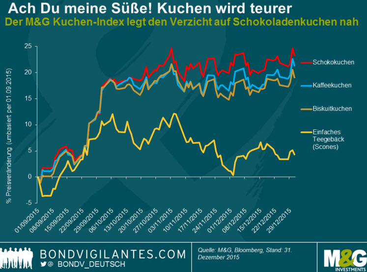 | Sie brauchen eine Motivation für Ihren Diätvorsatz im neuen Jahr? Der Kuchen-Index von M&G zeigt, dass Kuchen teurer wird! | |