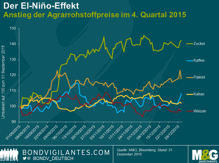 Im September hatten wir hier die möglichen Auswirkungen des Wetterphänomens El Niño erörtert. Nur wenige Monate später zeichnet sich nun ein klareres Bild ab, da die Auswirkungen jetzt weltweit in allen wichtigen Anbauregionen zu beobachten sind. Indonesien (der weltweit größte Palmölproduzent) und Afrika (Kakaoexporteur) haben Dürreperioden erlebt, während Brasilien (der weltweit wichtigste Zucker- und Kaffeeproduzent) von starken Regenfällen und den schlimmsten Überschwemmungen seit 50 Jahren heimgesucht wurde. Das sind alles Erscheinungen, die auf El Niño zurückgeführt werden. Infolge der witterungsbedingten Versorgungsängste und Lieferengpässe zogen die Preise für Zucker, Palmöl, Kaffee und Kakao im 4. Quartal 2015 um 42%, 18%, 8% bzw. 2% an.