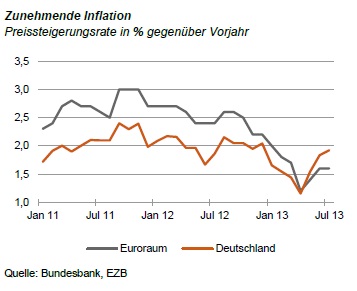 Im Augenblick sieht es aber nicht danach aus. Das Wachstum im Euroraum ist nach wie vor niedrig, auch wenn im zweiten Quartal glücklicherweise die Rezessionsphase überwunden wurde. Der starke Eurokurs auf den Devisenmärkten verbilligt die Importe. Die Rohstoffpreise steigen nicht so stark, auch nicht Benzin (trotz der Feriensaison). Selbst in den USA mit viel höheren Wachstumsraten gibt es bisher keine nennenswerte Inflation (2,0 %).