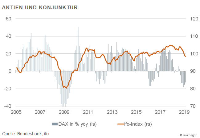 Natürlich hängt die Entwicklung der Aktienkurse von der Konjunktur ab. Wenn sich die gesamtwirtschaftliche Aktivität abschwächt, gehen die Gewinne zurück. Damit entfällt die wichtigste Triebkraft der Aktienkursentwicklung. Dass im Abschwung auch die Zinsen sinken, hilft den Unternehmen zwar. Aber letztlich reicht es nicht, die Konjunktur zu drehen.