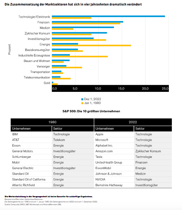 Die Historie ist möglicherweise kein guter Anhaltspunkt für die künftige Entwicklung. Die Märkte von heute sehen ganz anders aus als jene in den inflationären 1970er- und 1980er-Jahren. So hat sich beispielsweise die Gewichtung von Technologiewerten im MSCI World seit 1980 mehr als verdreifacht und macht heute 24 % des Index aus (Abbildung). Viele der heutigen Technologie- und Mediengiganten gab es noch nicht, als wir das letzte Mal mit Inflation konfrontiert waren, sodass wir nicht wissen, wie sich ihre Geschäfte entwickeln werden. Die Dominanz der Energieunternehmen in den Aktienindizes hat abgenommen. So wie die Macht der führenden Unternehmen von gestern geschwunden ist, glauben wir, dass die Gewinner von morgen aus gänzlich anderen Bereichen kommen werden.