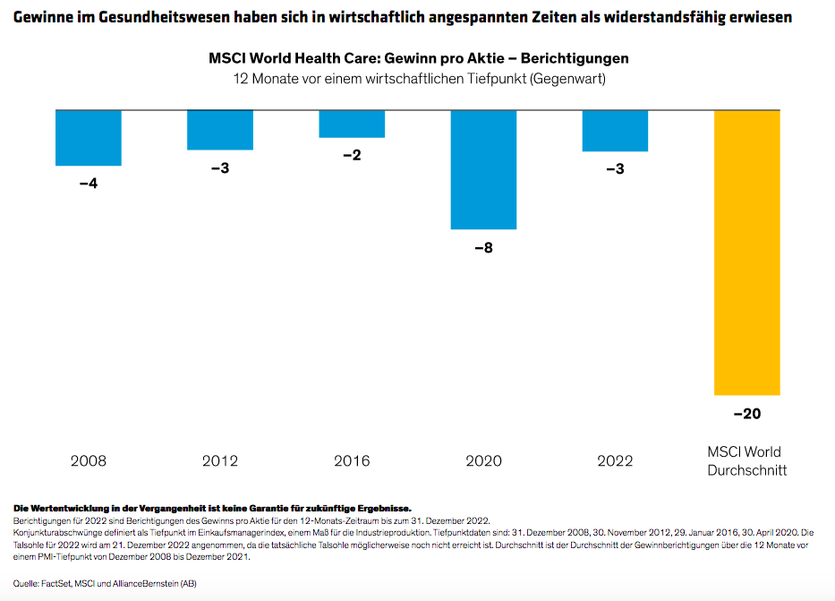 Unseres Erachtens kann das Gesundheitswesen eine wichtige Rolle bei der Aktienallokation spielen. Die Ausrichtung auf langfristiges, demografisch bedingtes Wachstum macht die Gesundheitsunternehmen weniger anfällig für das konjunkturelle Umfeld. Über die Humanmedizin hinaus ist die Tiergesundheit ein aufstrebendes Geschäftssegment, das durch steigende Ausgaben für Haustiere angetrieben wird, die bei einer Konjunkturabschwächung wahrscheinlich nicht nachlassen werden. In der gesamten Branche ist das Umsatzwachstum in unsicheren Zeiten relativ stabil, und viele Gesundheitsunternehmen verfügen über eine starke Preissetzungsmacht – ein wichtiges Attribut bei hoher Inflation. Die Gewinne haben sich im Allgemeinen in wirtschaftlich schwierigen Zeiten gut gehalten (Abbildung). Infolgedessen sind die Aktienkurse im Gesundheitssektor oft weniger volatil als in anderen Sektoren. Ein strategisch aufgebautes Gesundheitsportfolio kann Anlegern also sowohl offensive als auch defensive Eigenschaften bieten: solides Wachstumspotenzial in steigenden Märkten und weniger Abwärtsrisiko.