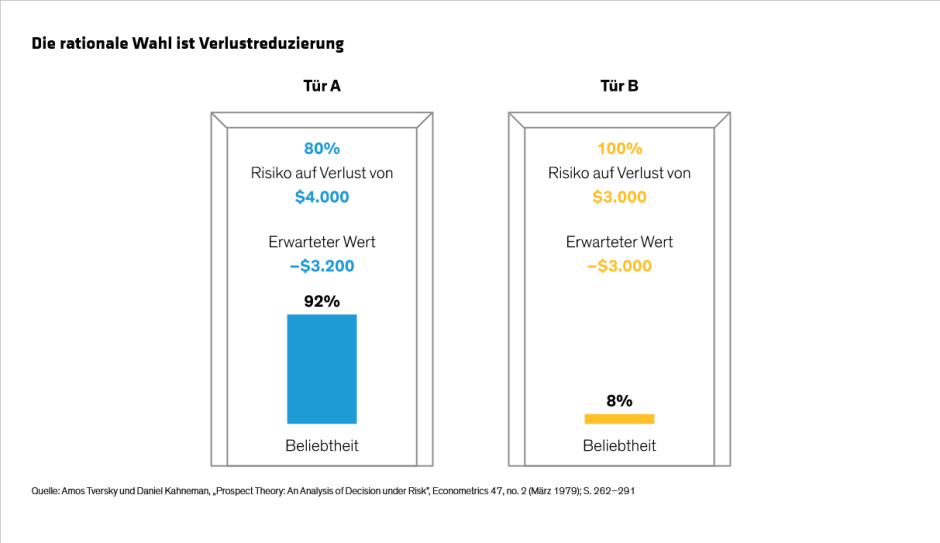 Was passiert, wenn das Szenario umgedreht wird? Jetzt besteht hinter Tür A eine 80%ige Chance, 4.000 US-Dollar zu verlieren – ein Erwartungswert von 3.200 US-Dollar –, während hinter Tür B eine Garantie besteht, 3.000 US-Dollar zu verlieren. Dieser Verlust von 3.000 US-Dollar würde die Verluste nach unten begrenzen, aber es stellt sich heraus, dass die meisten Teilnehmer lieber einen Verlust von 4.000 US-Dollar riskieren würden für die geringe Chance, nichts zu verlieren (Abbildung).