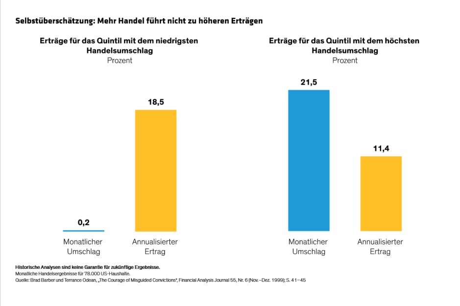 Eine weitere menschliche Neigung ist Selbstüberschätzung. Eine Studie aus dem Jahr 1999, an der fast 80.000 US-Haushalte teilnahmen, ergab, dass Haushalte, die am seltensten in ihren Aktiendepots handelten, auf Jahresbasis um sieben Prozentpunkte höhere Erträge erzielten als Haushalte, die am häufigsten handelten. Die Forscher führten diesen Unterschied auf das übermäßige Vertrauen der Anleger in ihre eigenen Fähigkeiten bei der Aktienauswahl zurück – eine Selbstüberschätzung, die zu niedrigeren Erträgen führte (Abbildung).
