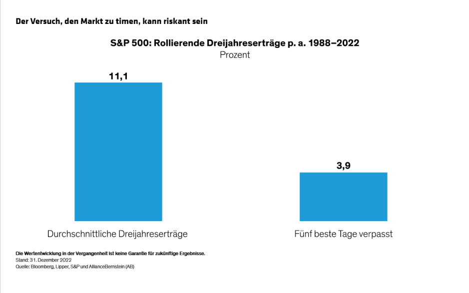 Diese Strategie zeigt ihre Stärke insbesondere bei fallenden Märkten. Im Erfolgsfall würde das Portfolio im Durchschnitt nur 70 % so stark fallen wie der breite Markt. Das hilft, Verluste zu verkraften und wirkt der Verlustaversion entgegen, die Anleger dazu veranlassen könnte, sich vorzeitig aus dem Markt zurückzuziehen. Die Forschung zeigt, dass das Verpassen der fünf besten Tage einer Markterholung die langfristigen Erträge stark beeinflussen kann (Abbildung).