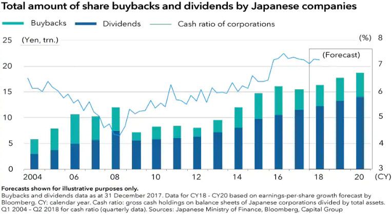 Public pension funds are also demanding more accountability from asset managers, pushing some firms to improve dialogue with investors and focus on returns. Japan’s Government Pension Investment Fund, the largest pension fund in the world, is using its influence to drive stronger corporate governance practices. Furthermore, there is added pressure to increase dividend payouts and share buybacks, which should help enhance shareholder returns. The chart below shows a marked increase in the total amount of dividends distributed in recent years, but Japanese firms took a back seat on share buybacks, which dropped sharply in 2017 after a record run.