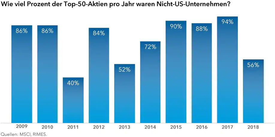 Fast jedes Jahr innerhalb dieses Zeitraums waren die meisten dieser 50 größten Unternehmen außerhalb der USA angesiedelt. Mit einem Fokus auf die USA hätten wir also viele der besten Chancen verpasst. Wir investieren nicht in Länder, Regionen oder Volkswirtschaften – wir investieren in Unternehmen.