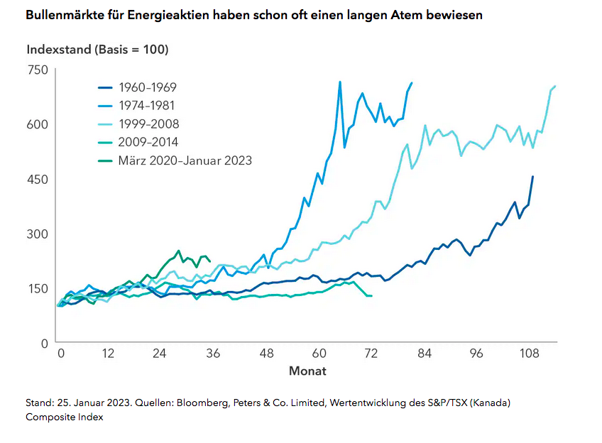 Die Analyse früherer Bullenmärkte für Energieaktien (als Beispiel zeigen wir in der nachstehenden Grafik Kanada) deutet darauf hin, dass wir uns noch in den Anfängen einer positiven Wertsteigerung des Sektors befinden könnten. Unterstützt durch höhere Energiepreise erwirtschafteten die Unternehmen des Sektors im Jahr 2022 einen rekordverdächtigen geschätzten freien Cashflow (free cash flow, FCF) von 1,4 Billionen US-Dollar. Die Bewertungen sind in Bezug auf eine Reihe von Kennzahlen wie das Kurs-Gewinn- sowie das Kurs-Buchwert-Verhältnis weiterhin attraktiv. Und die Widerstandsfähigkeit der Ölaktien angesichts fallender Ölpreise in den letzten drei Monaten deutet darauf hin, dass die Anleger über eine kurzfristige Schwäche des zugrunde liegenden Rohstoffpreises hinwegsehen.