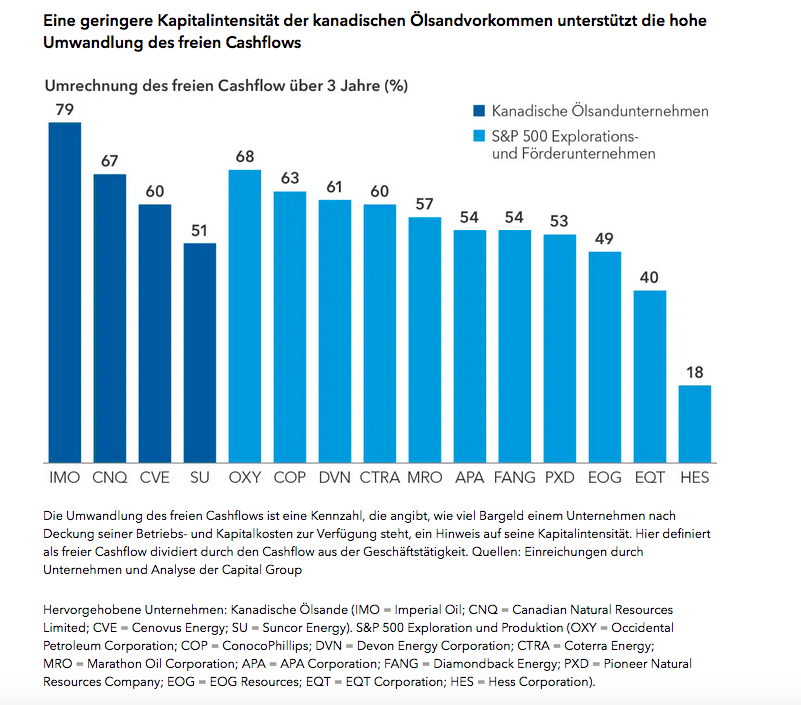 Die Ansicht, dass die Produktionskosten für kanadische Ölsande in der Region Alberta hoch sind, ist ziemlich weit verbreitet. Aber die tatsächlichen Gegebenheiten vor Ort ändern sich. Die Kosten für die Ölförderung sind dort in den vergangenen beiden Jahrzehnten gesunken. Die lange Lebensdauer und der geringe Verfall dieser Anlagen bedeuten, dass die Kapitalintensität, die zur Aufrechterhaltung des Betriebs erforderlich ist, im Vergleich zu US-Konkurrenten vergleichsweise gering ist, und sie ermöglichen eine hohe Generierung von freiem Cashflow, d. h. von Cashflow, der die Betriebs- und Kapitalkosten des Unternehmens übersteigt. Darüber hinaus werden die kanadischen Ölsandaktien häufig mit Bewertungsabschlägen gegenüber der US-amerikanischen Explorations- und Produktionsvergleichsgruppe gehandelt. Dies ist zum Teil auf Umweltbedenken und die hohe Kohlenstoffintensität der Produktion pro Barrel zurückzuführen.