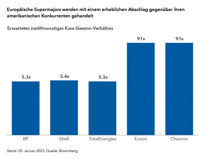 Die Managementteams ausgewählter US-amerikanischer und europäischer Ölgiganten arbeiten mit der stärksten Kapitaldisziplin seit Jahrzehnten und die Dividenden bieten den Anlegern ein gewisses Polster, selbst wenn die Ölpreise von nun an nachgeben sollten. Die Supermajors könnten von den länger anhaltenden höheren Öl- und Gaspreisen profitieren, die den vorgelagerten (Upstream-) Explorations- und Produktionsunternehmen zugute kommen – zusätzlich zu den rekordverdächtigen Raffineriemargen im nachgelagerten Bereich, denen reine Upstream-Unternehmen nicht ausgesetzt sind. Auf der Bewertungsbasis werden die europäischen Supermajors, was das Kurs-Gewinn-Verhältnis betrifft, trotz sehr ähnlicher Geschäftsmerkmale mit einem überdurchschnittlichen Abschlag gegenüber ihren US-Konkurrenten gehandelt.