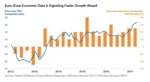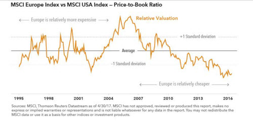 Nicht nur die französischen Wahlen verschaffen den europäischen Märkten dabei allerdings Rückenwind. Der positive Gesamtausblick stützt sich auf mehrere Faktoren: Hinzu kommen nämlich Anzeichen für mehr Wirtschaftswachstum, im Vergleich zu anderen Industrieländern attraktive Aktienbewertungen und die allmähliche US-Dollarabwertung. Der starke Dollaranstieg seit 2014 hat die Erträge europäischer Titel für dollarbasierte Anleger geschmälert.