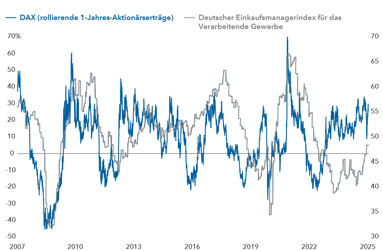 Quellen: FactSet, S&P Global. Daten vom 1. Juni 2007 bis zum 8. Mai 2025. Stand des rollierenden 1-Jahres-Aktionärsgesamtertrag des DAX 8. Mai 2025. Stand des deutschen Einkaufsmanagerindex (PMI) für die Fertigung 30. April 2025.