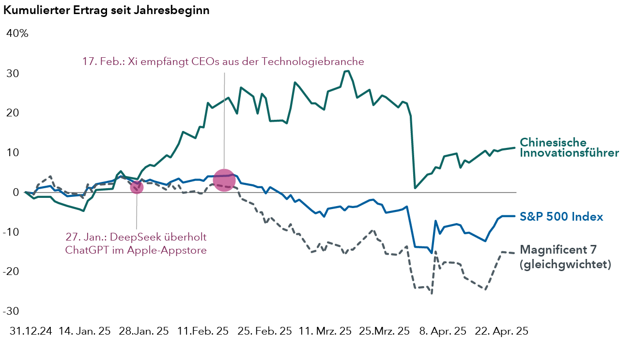 Quelle: FactSet. Magnificent 7: Alphabet, Amazon, Apple, Meta, Microsoft, Nvidia und Tesla. Chinas Innovationsführer: Alibaba, BYD, JD.com, Meituan, NetEase, PDD-US und Trip.com. Daten vom 31. Dezember 2024 bis zum 28. April 2025.
