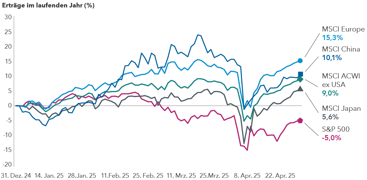 „Nach der Bekanntgabe der Zolländerungen am 2. April waren US-Aktien und Aktien aus anderen Ländern hoch korreliert – so wie man es in Phasen mit starker Marktvolatilität erwartet“, sagt Aktienportfoliomanager Samir Parekh. „Sobald sich die Wogen geglättet haben, wird es für nicht US-Aktien besser aussehen. Ihre Bewertungen sind viel niedriger als die von Aktien aus den USA. Viele außerhalb der USA ansässigen Unternehmen sind an ihrem Heimatmarkt tätig und bleiben deshalb von den Folgen der US-Politik verschont. Außerdem verbessert sich in vielen Ländern die Corporate Governance.“