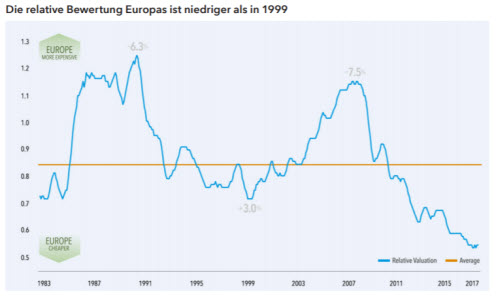 Als die Bewertungen in Europa im Vergleich zu den USA hoch waren, sind die Langfristerträge tendenziell zurückgegangen. Als die Bewertungen in Europa im Jahr 1990 hoch waren, ist Europa um 6,3% annualisiert über die nächsten zehn Jahre hinter den USA zurückgeblieben. Dagegen war Europa im Jahr 1999 unterbewertet und hat die USA die folgenden zehn Jahre um jährlich 3,0% hinter sich gelassen. Heute sind die relativen Bewertungen sogar noch niedriger als in 1999.