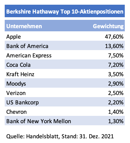 Kurssteigernd wirkt sich aktuell aus, dass Berkshire in Unternehmen investiert ist, die von steigenden Zinsen profitieren können – wie etwa große Energie- und Industriekonzerne. Bei Tech-Konzernen bleibt Buffett weiterhin wählerisch. Etliche IT-Unternehmen, die lange Zeit zu den absoluten Stars an der Wall Street zählten, leiden derzeit unter den steigenden Zinsen. Eine Ausnahme ist der Branchenprimus Apple, der mit weitem Abstand größten Aktienposition im Portfolio der Berkshire Hathaway. Die Apfel-Aktie füllt das Berkshire-Portfolio fast zur Hälfte. Das ist schlecht für die Diversifikation, aber offensichtlich gut für die Performance.