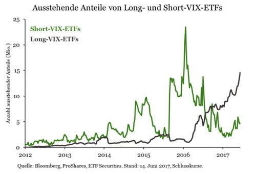 Auf der anderen Seite dieses Geschäfts stehen Anleger, die die Rekordtiefs des VIX als Chance für den Kauf einer Long-Position sehen, da sie einen Anstieg der Volatilität befürchten. Wie an ausgewählten ETFs sichtbar wird, haben die ausstehende Anteile von Short-VIX-ETFs abgenommen, während die ausstehenden Anteile von Long-VIX-ETFs deutlich zunahmen. Dieser Trend kam nicht lange nach der ersten Zinsanhebung der Fed im Dezember 2015 auf.
