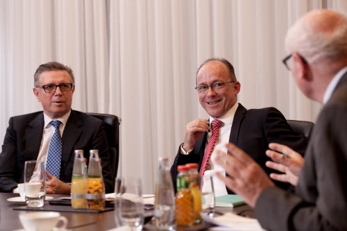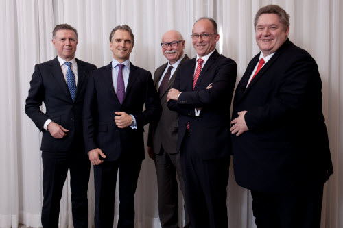 (Foto: v.l.n.r.: Roundtable-Teilnehmer (v.l.): Karl-Josef Schneiders. CEO Assetmanagement Germany Credit Suisse; Werner Kolitisch, Country-Head M&G; Dr. Martin Hüfner, Moderator; Dr. Martin Dilg,Country-Head AB-Funds; Alexander Froschauer, Leiter Fixed Income AXA IM)