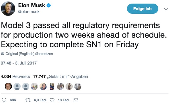 Die Produktion des sehnlich erwarteten Model 3 soll demnach noch in diesem Monat beginnen, ab August werden wohl die ersten Wagen vom Band rollen. Ende Mai lag der Stand der Vorbestellungen zwischen 400.000 und 500.000. Am Morgen zog die Tesla-Aktie fast zwei Prozent an. Tesla ist an der Börse knapp 53 Milliarden Euro wert – Konkurrent BMW bringt es nur auf eine Marktkapitalisierung von 52 Milliarden Euro.