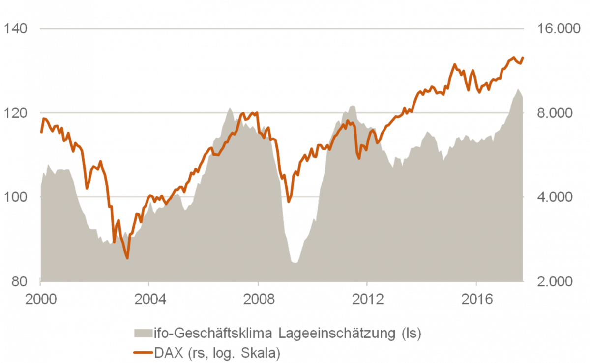 Zweitens ist die Konjunktur stabil. Sie hat zuletzt gerade wieder angezogen. Das führt dazu, dass die Gewinne der Unternehmen steigen und die Kurse anziehen. Die Korrelation zwischen dem DAX und dem ifo-Geschäftsklimaindex ist hoch (0,72) (siehe Grafik). Dabei sollte man sich nicht von kurzfristigen monatlichen Schwankungen des Geschäftsklimas (wie Anfang der Woche wieder bekannt gegeben) irritieren lassen.