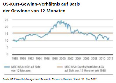 Viele US-Aktien verfügen aufgrund ihres günstigen Kurs-Gewinn-Verhältnisses (KGV) – einer wesentlichen Kennziffer für die Bewertung einer Aktie – über weiteres Wertsteigerungspotenzial. Der aktuelle Kurs vieler US-Aktien ist in Relation zum (geschätzten) Gewinn des jeweiligen Unternehmens pro Aktie vergleichsweise niedrig. Dadurch bieten sich für Anleger gute Einstiegschancen. Das KGV des MSCI USA (auf Basis der Gewinne von 12 Monaten) liegt mit 11,8 deutlich unter dem durchschnittlichen KGV des Index, das aktuell einen Wert von 15,5 aufweist. Dies geht aus einer aktuellen Berechnung von UBS hervor. Der MSCI USA enthält rund 85 Prozent der gesamten Marktkapitalisierung des USAktienmarkts. Der breitgefasste Index bildet die allgemeine Wertentwicklung des US-Aktienmarkts ab.