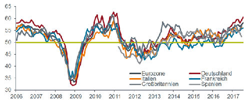 Leiden Europas Märkte unter Brexit-Ängsten?Nach wie vor herrscht große Verunsicherung über die langfristigen Folgen der von den Briten mit dem Brexit-Referendum vom 23. Juni 2016 getroffenen Entscheidung, aus der Europäische Union auszutreten. Auch unter Ökonomen ist strittig, wie groß die Auswirkungen sein werden. Dennoch fallen die Konsensschätzungen zum Wachstum in Großbritannien bislang weniger vernichtend aus, als viele erwartet hatten. Schützenhilfe für die Insel kommt von rekordniedrigen Zinsen. Sie erleichtern die Kreditaufnahme und ermuntern zu vermehrten Konsumausgaben und Investitionen. Über die Langzeitwirkung einer derart entgegenkommenden Geldpolitik wird sich die Bank von England (BoE) aber wohl noch Gedanken machen müssen. Als Barometer der Lage im verarbeitenden Sektor gelten die Einkaufsmanagerindizes (PMI). Sie geben Aufschluss über Änderungen der Ausgabenpläne in Unternehmen, über deren Lagerbestände und Auftragsbücher sowie die Beschäftigungslage. Damit sind sie ein wichtiger Gradmesser der aktuellen Geschäftslage und ganz allgemein der Entwicklung in der Wirtschaft. Der von Markit erhobene PMI für das verarbeitende Gewerbe im Euroraum erreichte im Juni und August einen Stand von 57,4 Zähler. Das war der höchste Wert seit sechs Jahren, dargestellt in Grafik 1. Grafik 1: Unternehmen in der Eurozone sind unverändert optimistisch