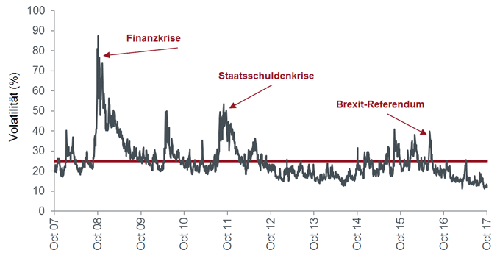 Momentan haben wir es offenbar mit dem besten Wirtschaftsumfeld in Europa seit Jahren zu tun, wenngleich bei den Schätzungen die Folgen der Brexit-Verhandlungen bislang unberücksichtigt bleiben. Die Gespräche zwischen dem EU-Chefunterhändler Michel Barnier und dem britischen Brexit-Minister David Davis befinden sich jedenfalls in einer entscheidenden Phase. Ein schlechter Deal könnte beiden Seiten schaden. Dennoch bleiben die Anleger bislang gelassen. Verhaltene Volatilität am Markt – bei zugleich bangem Blick in die ZukunftIn der Marktvolatilität, das heißt dem Auf und Ab an einer Börse, findet die Stimmung der Anleger und ihr Vertrauen in die allgemeine wirtschaftliche Entwicklung ihren Widerhall. In einem „stark volatilen“ Markt, zu beobachten überlicherweise in Zeiten mit Unsicherheiten über den Konjunkturverlauf, kommt es häufig zu dramatischen Kursschwankungen. Dagegen ändern sich in Phasen mit geringer Marktvolatilität die Kurse vergleichsweise stetig und vorhersagbar. Grafik 2: An den europäischen Märkten ist es relativ ruhig