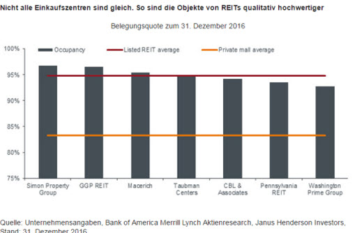 Stattdessen nehmen sie experimentelle und Kundenservice-Elemente auf und verlagern den Mietermix aktiv in Richtung stärkerer Akteure. Die Einkaufszentren börsennotierter Vermieter, die etwa die Hälfte aller US-Malls ausmachen, blieben weitgehend unbeührt von den meisten angekündigten Schließungen namhafter Kaufhäuser. Von den 421 Schließungen, die 2017 von Sears, Kmart, Macy’s und JC Penny bekanntgegeben wurden, entfielen nur 31 auf Einkaufszentren von US-REITs. In der Regel zeichnen sich Einkaufszentren börsennotierter Vermieter durch höhere Belegungsquoten (siehe Abbildung), höhere Umsatzproduktivität und konstante Betriebsergebnisse aus.