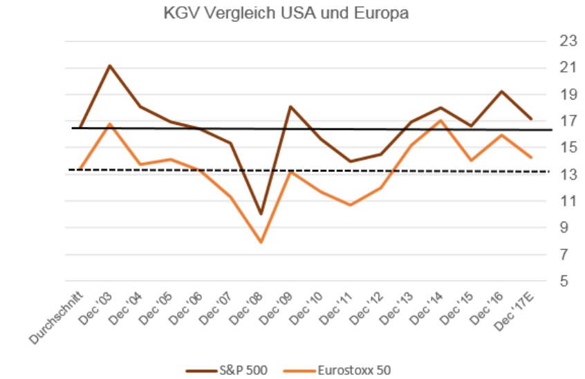 Die historische Performance beider Märkte spricht eine klare Sprache – trotz fortlaufend „höherer“ Bewertung der US-Märkte: während der S&P 500 seit Anfang 2010 bis Ende 2016 eine Rendite von 12,8% p.a. (in USD) erwirtschaften konnte, haben europäische Aktien in diesem Zeitraum nur 4,65% (in EUR) verdient (Quelle: Factset Research, Dividenden reinvestiert, S&P 500 Performance ist deshalb in USD angegeben um den positiven Währungseinfluss seitens der USD-Aufwertung zu eliminieren). Qualität zahlt sich langfristig aus!