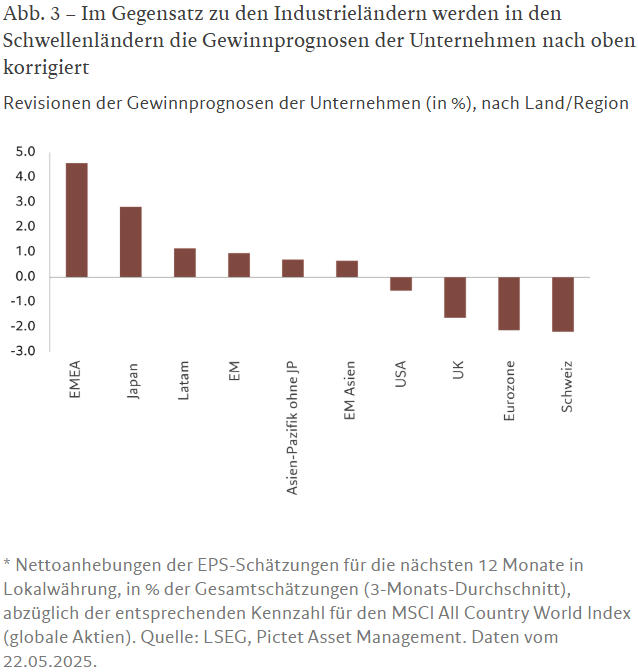 Das dürfte sich in Kursgewinnen für Unternehmen in den Schwellenländern niederschlagen. Nach übereinstimmenden Prognosen der Analysten werden die Unternehmensgewinne in den Schwellenländern in diesem und im nächsten Jahr schneller wachsen als in den USA und Europa. Wie Abbildung 3 zeigt, haben die Unternehmen der Schwellenländer ihre Gewinnprognosen nach oben korrigiert, während ihre Pendants in den Industrieländern, mit Ausnahme japanischer Unternehmen, ihre Gewinnschätzungen nach unten korrigiert haben.