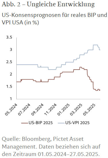 Im Mai lenkte Präsident Trump die Märkte für kurze Zeit mit seinem Steuer- und Ausgabengesetz „Big Beautiful Bill“ von seinen Zollankündigungen ab. Leider wird seine jüngste Politik wenig dazu beitragen, die langfristige wirtschaftliche Unsicherheit zu verringern. Ganz im Gegenteil. Zum einen wird das US-Defizit durch das Steuerprogramm weiterhin bei etwa 6,5% pro Jahr liegen, was bedeutet, dass die Schuldenlast der US-Regierung weiter steigen wird. Auch die Gefahr einer Stagflation bleibt bestehen – die Konsensschätzungen für das US-BIP sind in den letzten Monaten stark gesunken, während die Inflationsprognosen weiterhin deutlich über dem Ziel der US-Notenbank liegen (siehe Abb. 2).