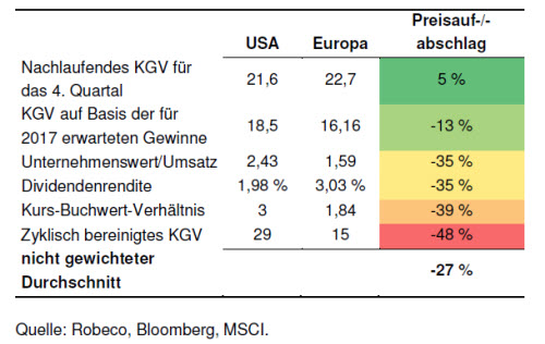 „Europäische Aktien sind erstaunlich unbeliebt. Und das trotz einer starken Bilanzsaison, die sie in Relation zu US-Titeln attraktiver gemacht hat“, stellt Lukas Daalder von Robeco fest. Für den Chief Investment Officer der niederländischen Fondsgesellschaft sprechen derzeit vier Faktoren für die Anlageregion Europa. Allerdings sollten Anleger die Risiken im Auge behalten. „Die US-Aktienmärkte sind stärker gestiegen als die zugrundeliegenden Unternehmensgewinne rechtfertigen, während europäische Aktien nicht mit dem Anstieg der Unternehmensgewinne im ersten Vierteljahr 2017 Schritt gehalten haben. Stattdessen konzentrieren sich Anleger auf eher unerfreuliche Themen wie den Brexit und die Ausbreitung von Populismus“, analysiert Lukas Daalder, Chief Investment Officer von Robeco Investment Solutions. Das bedeutet Daalder zufolge, dass US-Aktien „für Perfektion bepreist sind”, europäische Aktien dagegen „für Depression”.
