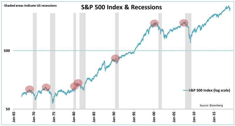 „Betrachtet man die letzten sieben Rezessionen in den USA, erreichte der S&P 500-Index im Schnitt sechs Monate vor dem offiziellen Beginn einen Höchststand“, sagt er. „Nur zweimal, 1980 und 1990, fiel der Höchststand am Aktienmarkt tatsächlich mit dem Beginn der Rezession zusammen. Allgemein tendieren die Aktienmärkte bis zu zwölf Monate vor einer Rezession solide nach oben, zeigen zwölf bis sechs Monate vor einer Rezession ein gemischtes, doch letztlich positives Bild und bewegen sich dann typischerweise innerhalb von sechs Monaten vor der Konjunkturabschwächung nach unten.“
