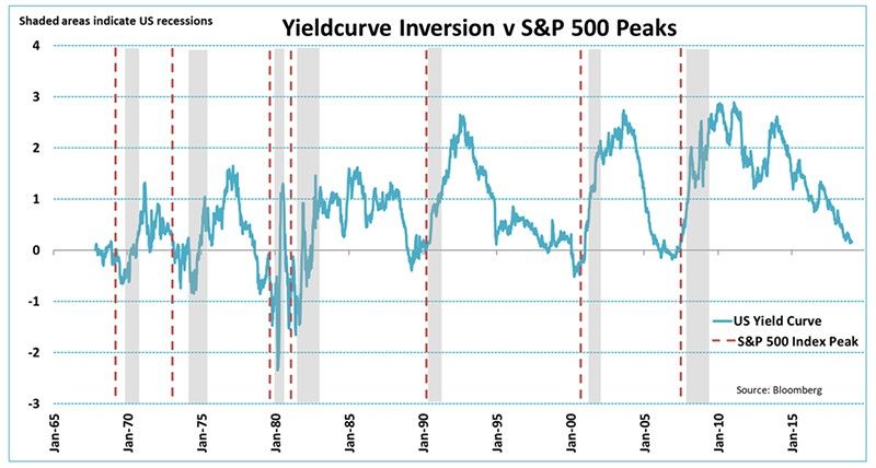 „Die Differenz zwischen der langfristigen und der kurzfristigen Rendite von US-Anleihen ist einer der besten – wenn nicht sogar der beste – verfügbare Rezessionsindikator“, sagt er. „Der Verlauf der Zinskurve hat alle sieben Rezessionen in den USA seit Dezember 1969 zuverlässig angekündigt. Folgende Daumenregel gilt: Nimmt die Zinskurve einen inversen Verlauf an, d. h. fallen die langfristigen Renditen unter die kurzfristigen, kommt es irgendwann innerhalb der nächsten ein, zwei Jahre zu einer Rezession.“