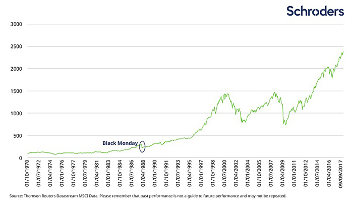 The chart below reflects the fluctuations in the US stockmarket since 1970. It illustrates how Black Monday registered as barely a blip in the long term and how resilient stocks have been over the last 47 years.