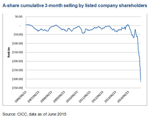 Listed companies’ major shareholders / management had cumulatively sold a total of RMB 400 billion worth of shares year-to-June, which is an unprecedented volume in A-share history. Cumulative new share issuance is estimated to be RMB 510 billion on a year-to-date basis (as of July 2015). We have also seen aggressive insider selling and corporate placement in Hong Kong as they are trying to benefit from the market strength and higher valuations in the first half of this year.